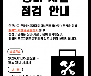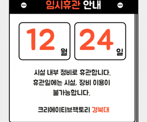 공지사항언론보도 게시물 검색 검색대상 제목 내용 제목+내용 회원아이디 회원아이디(코) 글쓴이 글쓴이(코) 검색어 필수 검색 크리에이티브팩토리(본원) 장비·시설 점검 안내 (2026.01.05. ~ 별도 안내 시까지) * 점검 종료 및 정상 운영 일정은 확정되는 대로 홈페이지 및 SNS를 통해 안내드리겠습니다. 크리에이티브팩토리(본원) 장비·시설 점검 안내 (2026.01.05. ~ 별도 안내 시까지) 2026.01.05 102 [경북대 휴관 안내] 2026년 1월 5일 ~ 9일 [경북대 휴관 안내] 2026년 1월 5일 ~ 9일 2026.01.02 94 [경북대 휴관 안내] 12월 24일 수요일 임시휴관 [경북대 휴관 안내] 12월 24일 수요일 임시휴관 2025.12.22 271 12월 크리에이티브팩토리(본원) 교육 모집 안내 - 4 *교육에 대한 자세한 내용 및 신청은 아래 링크에서 확인 가능합니다. 교육 문의 : 크리에이티브팩토리, 053-219-4000 12월 크리에이티브팩토리(본원) 교육 모집 안내 - 4 2025.12.05 532 12월 크리에이티브팩토리(본원) 교육 모집 안내 - 3 * 교육에 대한 자세한 내용 및 신청은 아래 링크에서 확인 가능합니다. 교육 문의 : 크리에이티브팩토리, 053-219-4000 12월 크리에이티브팩토리(본원) 교육 모집 안내 - 3 2025.11.26 725 2 메이커스페이스 현황 지도(대구지역) 지역 내 메이커스페이스 현황지도입니다. 메이커스페이스 현황 지도(대구지역) 2019.01.14 5992 1 크리에이티브팩토리 팜플렛(2018년) 크리에이티브팩토리(메이커스페이스 전문랩) 팜플렛입니다. 크리에이티브팩토리 팜플렛(2018년) 2018.11.14 2105